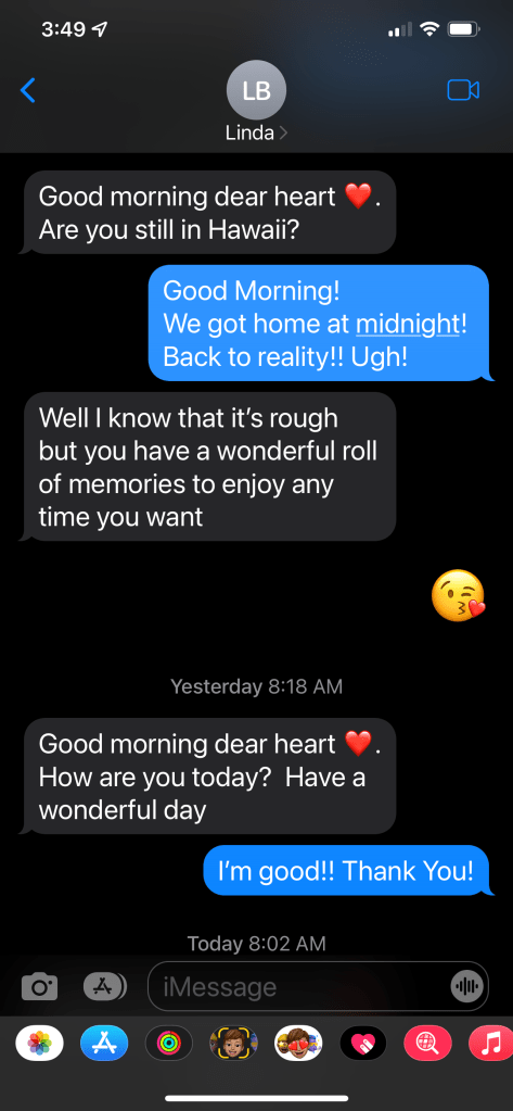 I had the shear pleasure of living with her for 7 weeks, last year. As I was going through Proton Radiation, I lived with my Aunt & Uncle. They so graciously opened up their home to me. It was my safe space as I was going through so much. I am so thankful I got to be by my Aunts side. I just don’t want her to forget me. Ever. I was scared she would see me and just look at me like – who are you? She never did. I would great her as soon as she woke up. I always go straight to her and say, HI!. Typically, louder than normal. I wanted her to know I was there. She did. Or did she? I never want to know if she didn’t. I always hug her and tell her how much I love her and how much she is loved.